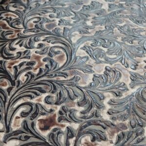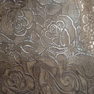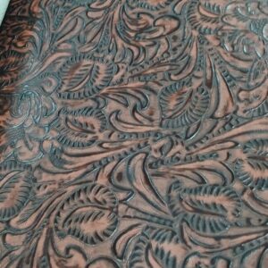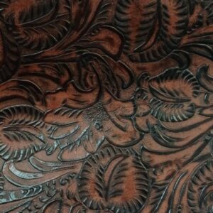Custom made embossed leather 2/3 oz. Quarters vary from 9-12 feet on average. Please call for an exact size.