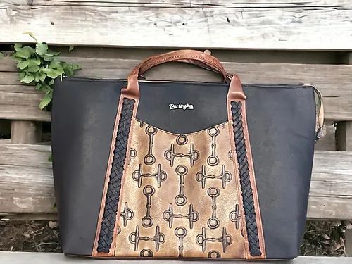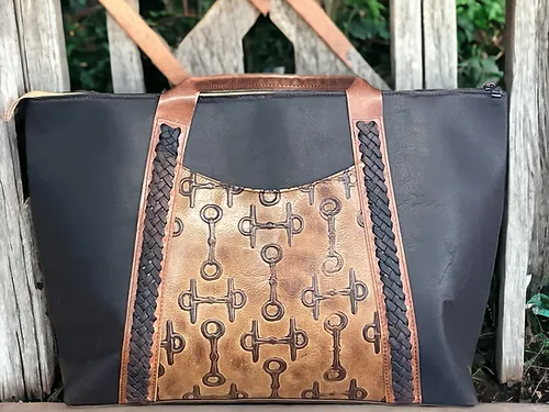 Proclaim your equestrian fascination with this gorgeous and spacious custom leather overnight bag. Every facet can be constructed according to your preference. This is a very large overnight bag with finished dimensions of 20x13x6. This OxBow is sold but we can make one just for you. Features include magnetic close slip pockets on the front and back plus huge interior pockets on each side. Choose from segmented slip pockets, open slip pockets or zippered pockets. The front features supple leather lace in the Mexican Weave style. FABULOUS!