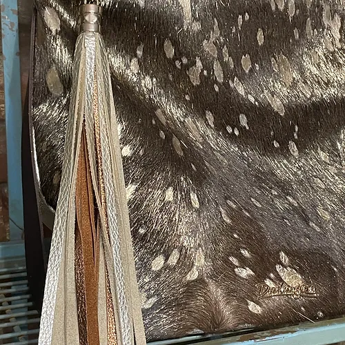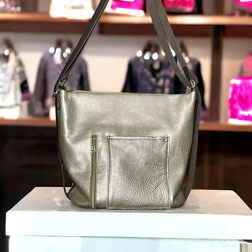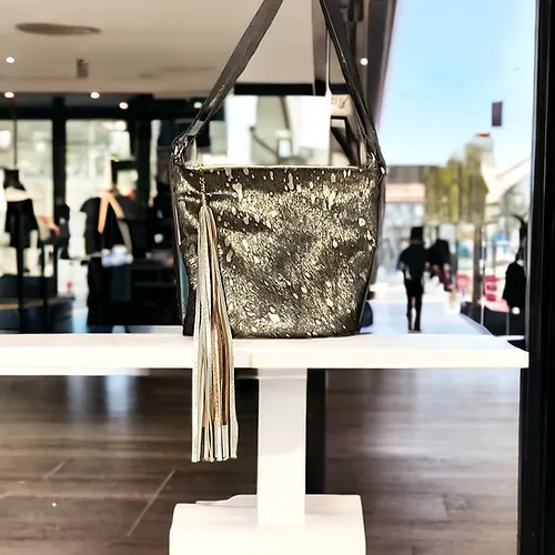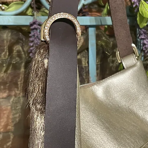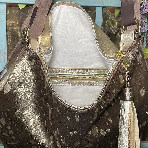 Are you a trendsetter, a woman with a certain je nais se quois, a fashion icon??? This Paradise Convertible is for you. Captivating gold tipped shimmer metallic hair on hide with gold acid wash marks you as a fashion maven! Buttery soft platinum Italian leather on the back features a handy slip pocket for your phone and a concealed carry pocket.